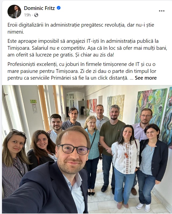 Mulțumesc, Dan, Monica, Adela, Alexandra, Camelia, Cosmin, Cristina, Iulia, Lucian, Rareș. Ei sunt superba echipă de voluntari IT care ne ajută să digitalizăm și transparentizăm Primăria. Am convenit cu ei că munca lor și toate programele de digitalizare la care lucrăm vor fi făcute open source pentru ca orice primărie din România să poată replica ce facem noi în Timișoara”, a postat pe Facebook, primarul Dominic Fritz, pe 11 octombrie 2023.