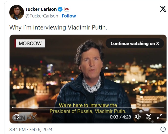 Confirmarea a venit marți, 6 februarie 2024, când Tucker Carlson a postat pe platforma X ( fosta Twitter) un mesaj video în care anunța scopul vizitei sale la Moscova: un interviu cu Vladimir Putin, președintele Fedrației Ruse.
