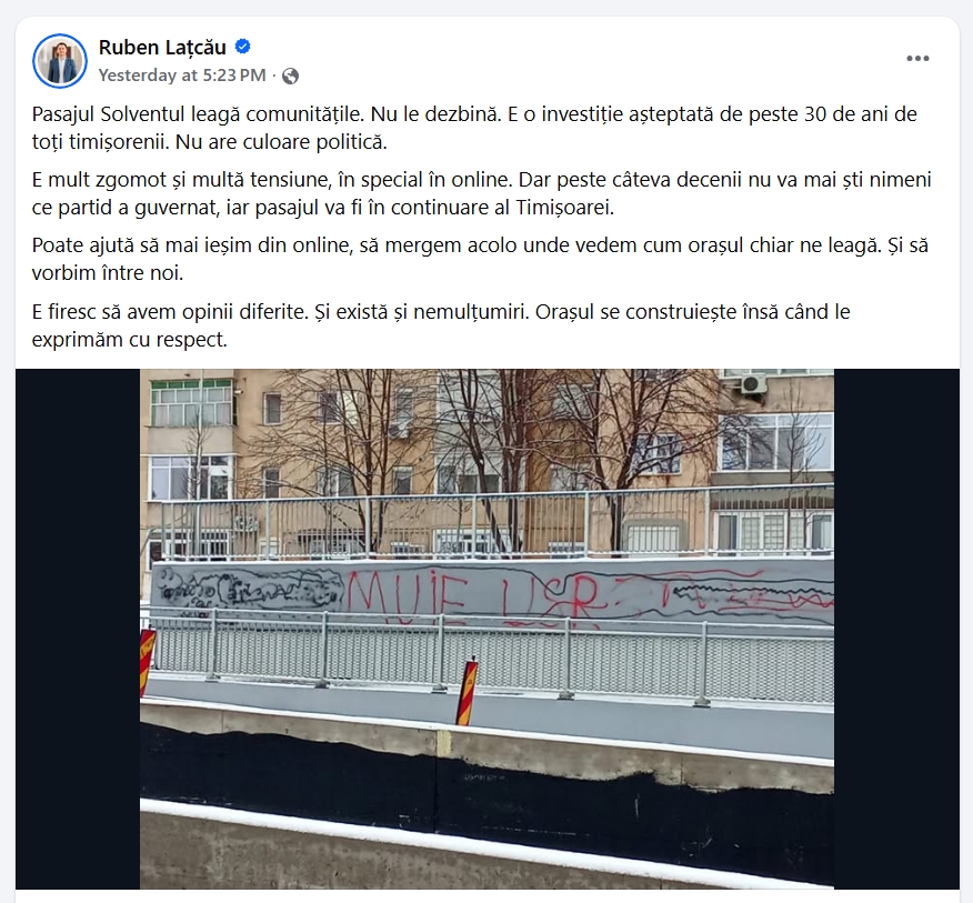 Pe 28 ianuarie 2026, viceprimarul Timișoarei, Ruben Lațcău, publică pe Facebook o fotografie de la Pasajul Solventul. Pe zidul pasajului, proaspăt reabilitat, este scris cu spray roșu mesajul: „Muie USR”.