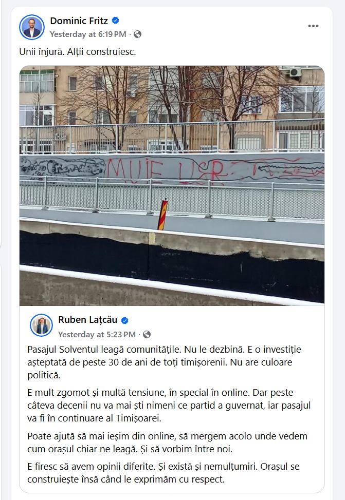 La mai puțin de o oră distanță, Dominic Fritz, primarul Timișoarei și președinte național al USR, preia postarea colegului său, cu fotografia intactă — mesajul obscen rămâne vizibil, neblurată, nerevizuită — și adaugă o propoziție scurtă, tăioasă, calculată pentru viralizare: „Unii înjură. Alții construiesc.”