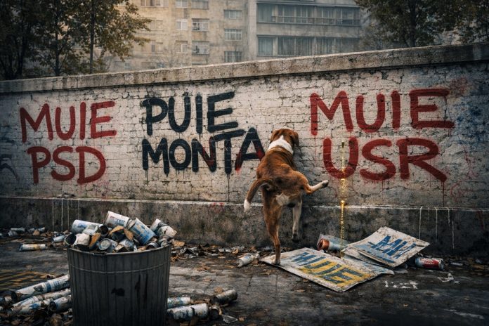 De la această fotografie banală, de pe un zid din Timișoara, se poate reconstrui întreaga istorie a degradării limbajului politic din România post-2017: de la „Muie PSD” la „plăcuța suedeză”, la „Puie Monta” și până la momentul în care obscenitatea își schimbă direcția și devine, peste noapte, inacceptabilă.