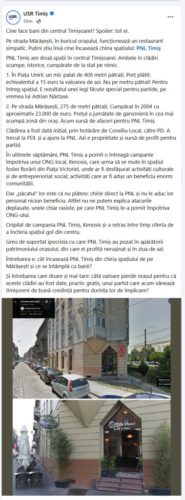 În postările recente, USR Timiș indică un restaurant care funcționează pe strada Mărășești ca exemplu al „profitului” realizat de PNL Timiș din chirii. Restaurantul respectiv – Little Hanoi – este însă chiriaș, nu proprietar, și nu a beneficiat de nicio hotărâre de Consiliu Local, de chirie simbolică sau de vreo facilitate acordată de stat.