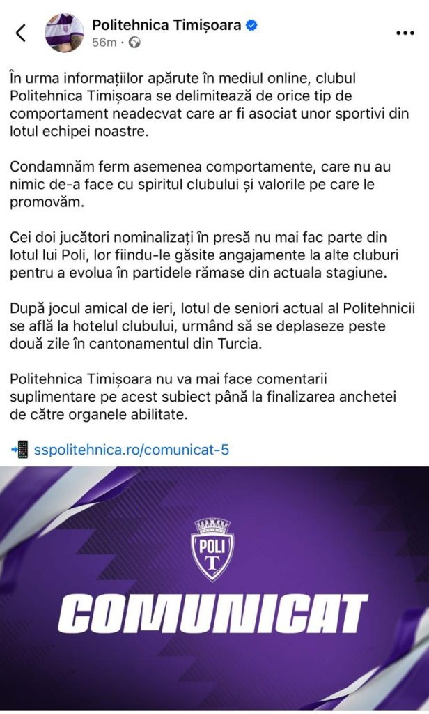 Clubul Politehnica Timișoara a transmis că „cei doi jucători nominalizați în presă nu mai fac parte din lot.” Formularea evită deliberat termenul „legitimați”. Postările publice ale clubului din ianuarie 2026 îi prezintă pe Denis Tătaru și Cosmin Huminic ca jucători activi sau afiliați, inclusiv în meciuri amicale. Delimitarea este, astfel, contrazisă de propriile materiale oficiale ale clubului.