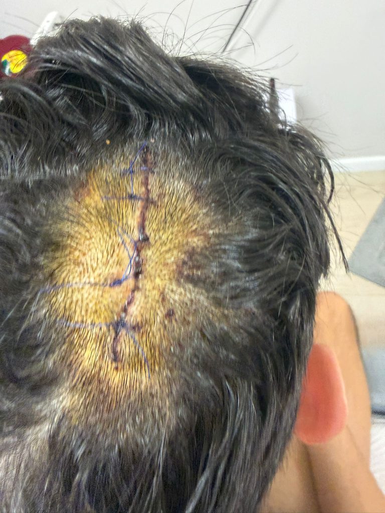 • hematom epicranian și plagă craniană suturată chirurgical, cu lungime de aproximativ 7 cm;