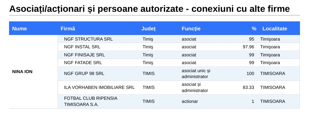 Pentru a înțelege dimensiunea reală a problemei, trebuie analizată schema de firme din jurul ILA Vorhaben. Alături de aceasta apar STEN BAUZEIT SRL și ILA VORHABEN IMOBILIARE SRL, entități diferite juridic, dar controlate în același cerc decizional.