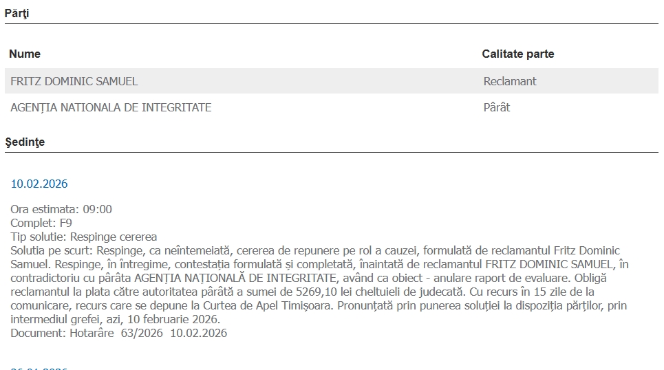 Pe 10 februarie 2026, la ora publicării minutei, un proces administrativ s-a încheiat și, simultan, un conflict politic a început. Curtea de Apel Timișoara a respins integral acțiunea prin care Dominic Fritz cerea anularea raportului Agenția Națională de Integritate. Din acel moment, cazul nu a mai evoluat în instanță, ci în spațiul public.