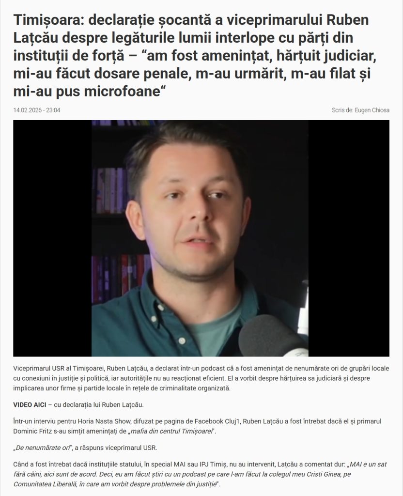 Dacă incompetența juriștilor din dosarul Schönherr ne-a arătat cum se pierd banii Timișoarei, noile dezvăluiri despre „munca” viceprimarului Ruben Lațcău ne arată cum se pierde simțul ridicolului. În timp ce Ruben Lațcău își ocupă timpul prin podcasturi clujene desenând scheme cu clanuri mafiote și rețele subterane care hărțuiesc „eroii” USR, realitatea administrativă ne livrează o imagine de un comic grotesc: viceprimarul este acuzat că a trișat exact acolo unde justiția – acel „sat fără câini” pe care îl blamează – i-a oferit șansa să demonstreze că este un cetățean model.
