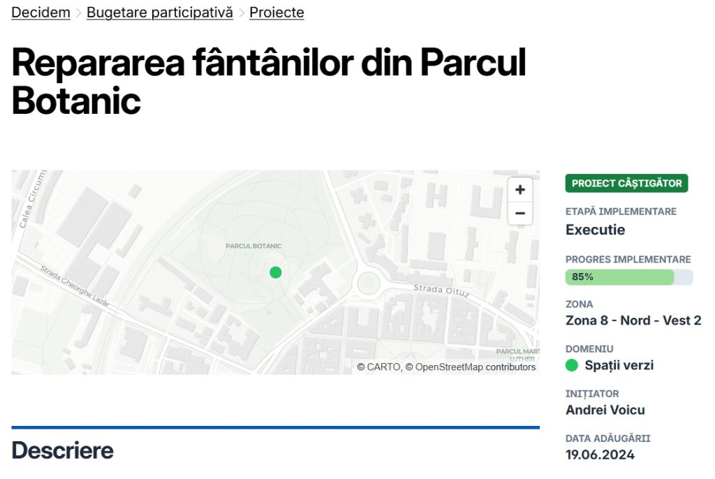 În 2024, prin programul de bugetare participativă al Primăriei, este votat proiectul „Repararea fântânilor din Parcul Botanic”. Inițiativa pornește de la o realitate simplă – bazinele decorative ale parcului nu mai funcționează de ani de zile, sunt pline de gunoaie și apă murdară, băltită.