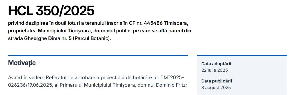 Procedura nu a fost însă rapidă. Abia în 2025 Consiliul Local aprobă oficial împărțirea terenului Parcului Botanic în două loturi distincte, dintre care unul devine drum public de acces.