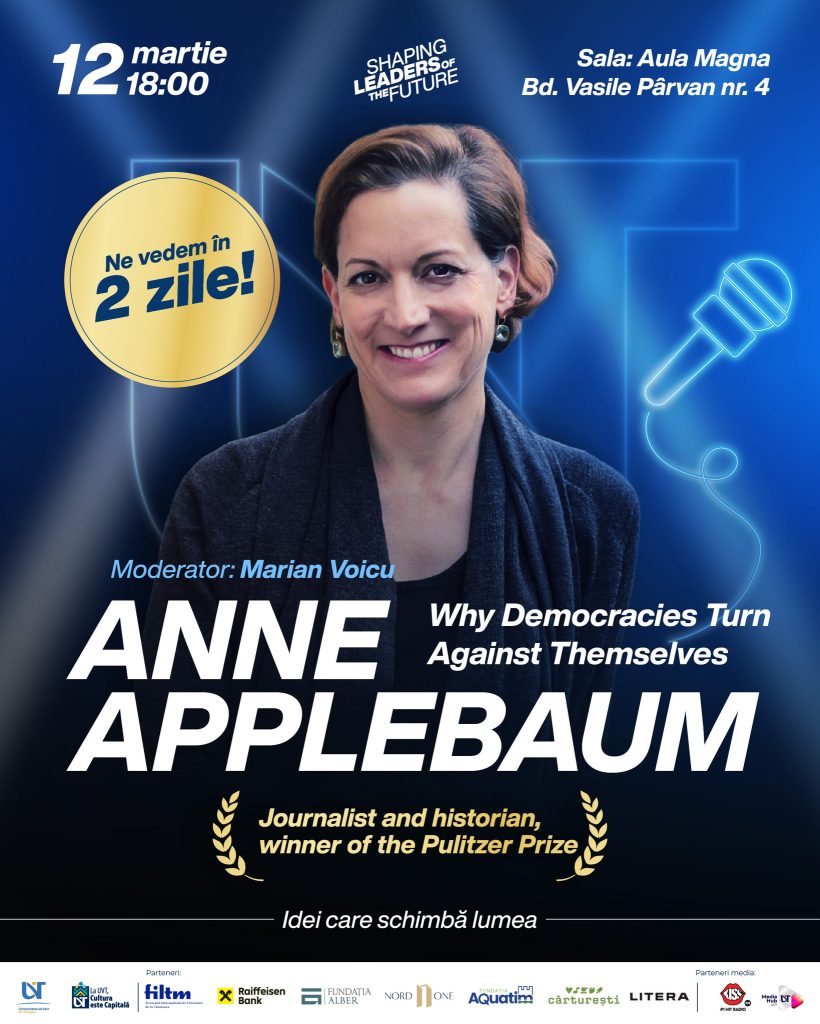 Un eveniment despre democrație și societate civilă, cu aproximativ 300 de locuri, a devenit rapid sold-out înainte să înceapă. Invitat principal este Anne Applebaum, una dintre cele mai influente voci ale liberalismului occidental contemporan.