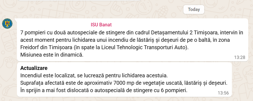 Comunicatul transmis de pompieri conține însă o formulare care atrage atenția: „7 pompieri cu două autospeciale de stingere din cadrul Detașamentului 2 Timișoara intervin pentru lichidarea unui incendiu de lăstăriș și deșeuri de pe o baltă.”