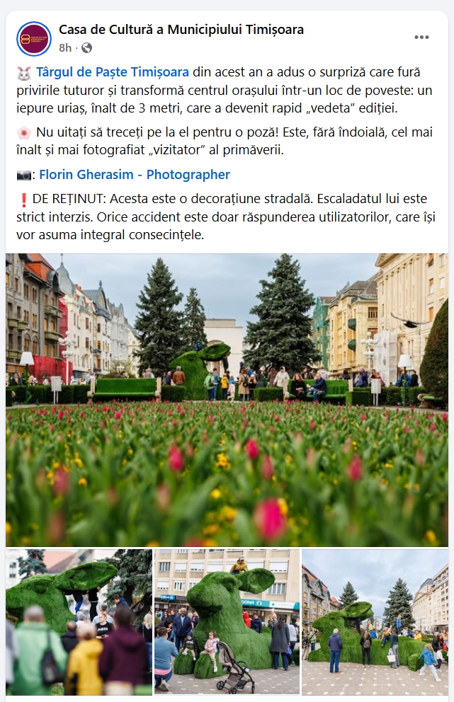 Postarea publicată de Casa de Cultură a Municipiului Timișoara este, la prima vedere, o bucată de comunicare standard, cu elemente de promovare, entuziasm, formulări despre „surpriza care fură privirile” și „vedeta ediției”. Iepurele este descris ca fiind „înalt de 3 metri” și „cel mai fotografiat vizitator al primăverii”, iar publicul este invitat explicit să treacă pe la el „pentru o poză”. Până aici, nimic neobișnuit. Este exact tipul de mesaj care construiește flux și încurajează interacțiunea.