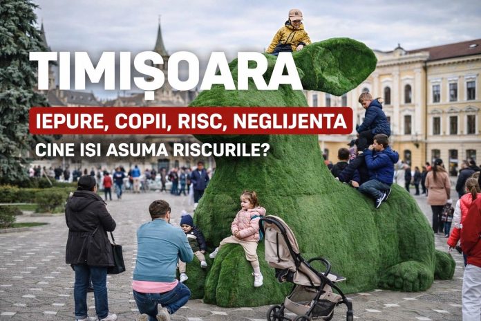 În centrul Timișoarei, la Târgul de Paște deschis oficial la ora 12, pe 27 martie 2026, „vedeta ediției” nu este o instalație artistică, ci un experiment de risc administrativ. Un iepure de aproximativ trei metri înălțime și peste opt metri lungime, acoperit cu gazon artificial, a devenit instantaneu loc de escaladă pentru copii de toate vârstele. Sute de copii s-au urcat pe structură în doar două zile, sub ochii părinților, ai bunicilor și ai organizatorilor.