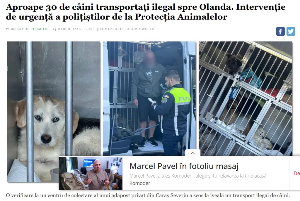Această poziționare vine pe un fond concret, nu teoretic. La doar câteva zile distanță de acest anunț, în 14 martie 2026, polițiștii din cadrul Biroului pentru Protecția Animalelor intervin într-un caz de transport ilegal de câini către Olanda, fiind vorba despre aproape 30 de animale scoase din țară în afara cadrului legal. La 23 martie 2026, un alt caz relevă descoperirea a 43 de câini ținuți în condiții improprii într-o gospodărie din Timiș, proprietarul fiind sancționat.