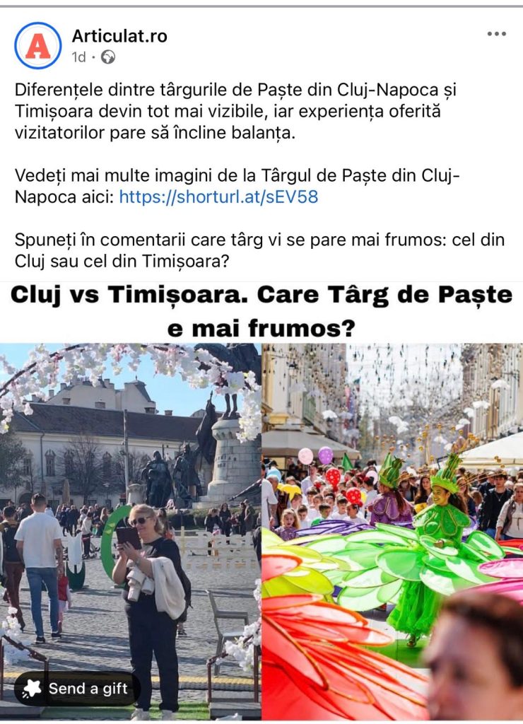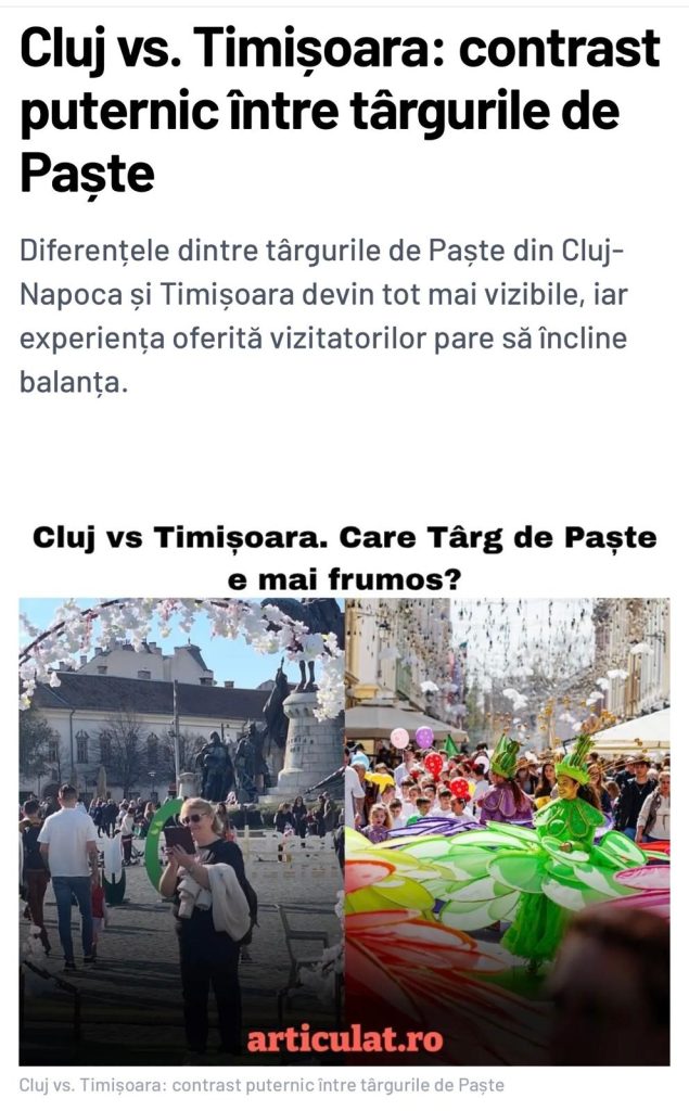Există manipulări grosiere, făcute cu barda, și există manipulări eșuate, dar mai elegante, făcute cu poză, adjectiv și întrebare fals inocentă. Articulat.ro a ales varianta a doua. A publicat un text cu titlul „Cluj vs. Timișoara: contrast puternic între târgurile de Paște” și a invitat publicul să decidă ce oraș „arată mai bine”.