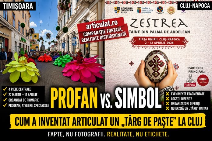 Mai mult, în Cluj rulează simultan și altceva, dar nu sub aceeași cheie administrativă și nici sub aceeași logică de eveniment urban integrat. Consiliul Județean Cluj promovează în Piața Unirii, în perioada 2–12 aprilie 2026, evenimentul „Zestrea – Taine din palmă de ardelean”, descris ca aducând tradiția și meșteșugul în inima orașului. Faptul că acest eveniment apare promovat separat, cu identitate distinctă și în altă locație, arată exact ce încearcă textul de la Articulat să șteargă cu buretele. La Cluj nu avem un singur „Târg de Paște” urban, coerent și asumat ca produs comparabil cu cel din Timișoara, ci un ansamblu de evenimente și formate diferite, unele pascale, altele de tradiție și meșteșug, care nu se adună automat într-un brand unitar doar pentru că dă bine într-un colaj pe Facebook.