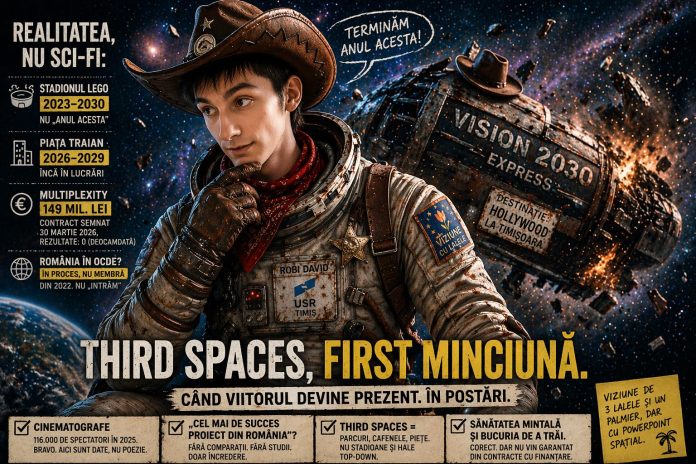 Celebrul erou planetar, Robi David, șeful gafelor pe social media la USRi Timiș, descoperă sociologia urbană și anunță viitorul la timpul prezent. Doar că, în documente, viitorul e încă pe șantier, cu termene clare, sume exacte și rezultate care nu există încă.