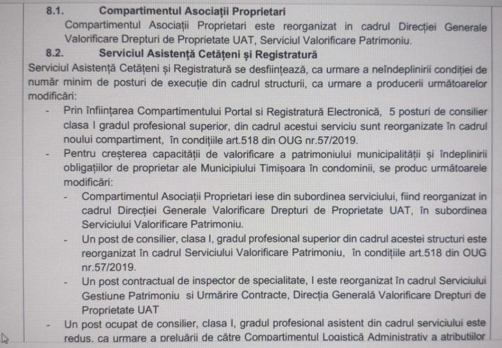Urmează mecanismul prin care această desființare este produsă. Documentul precizează explicit că cinci posturi de consilier din cadrul serviciului sunt mutate către o nouă structură, denumită Compartiment Portal și Registratură Electronică, în condițiile art. 518 din OUG nr. 57/2019 privind Codul Administrativ. Alte posturi sunt redistribuite către diferite direcții sau compartimente, iar unul este redus. Rezultatul este matematic: numărul de posturi rămase scade la șase, sub pragul minim de șapte necesar pentru existența unui serviciu, conform art. 391 alin. (3) lit. b) din același act normativ.