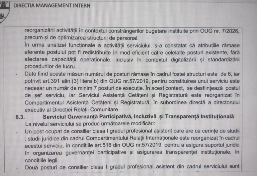 În acest context, documentul de reorganizare introduce o schimbare care, din punct de vedere tehnic, poate părea minoră, dar care, citită atent, devine fundamentală. La punctul 8.2, Serviciul Asistență Cetățeni și Registratură „se desființează ca urmare a neîndeplinirii condiției de număr minim de posturi de execuție în cadrul structurii”, iar atribuțiile sunt redistribuite către alte componente, inclusiv către nou-înființatul Compartiment Portal și Registratură Electronică. În același document se precizează că numărul de posturi rămase scade sub pragul legal necesar pentru existența unui serviciu, ceea ce duce automat la desființarea postului de șef serviciu și la transformarea structurii într-un compartiment aflat în subordinea directă a conducerii.