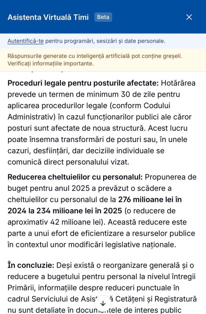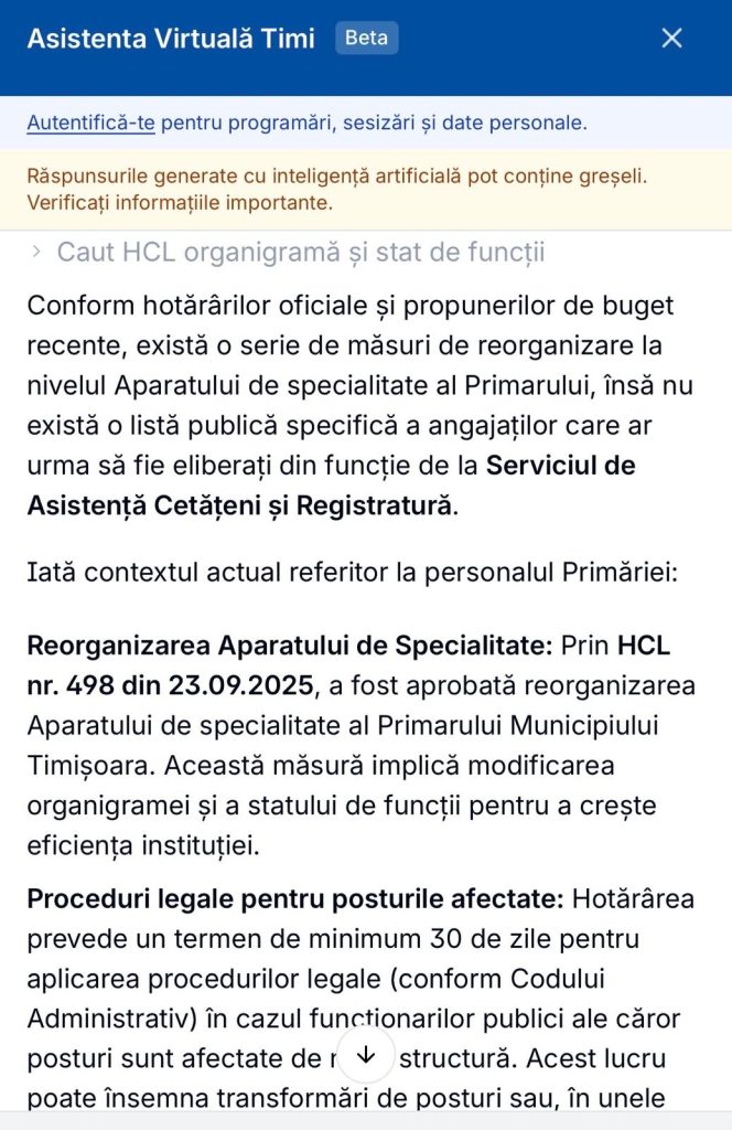 În același registru, se impune și o clarificare privind funcționarea concretă a instrumentelor digitale invocate. Dacă asistentul virtual „Timi”, lansat ca simbol al modernizării, nu poate răspunde la întrebări de bază despre utilizarea serviciilor și redirecționează cetățeanul către contactul direct cu instituția, în ce măsură poate fi el considerat o alternativă reală la interacțiunea umană? Și, mai ales, cum se explică faptul că un sistem aflat încă în fază de dezvoltare este utilizat implicit ca argument pentru restructurarea unui serviciu funcțional?