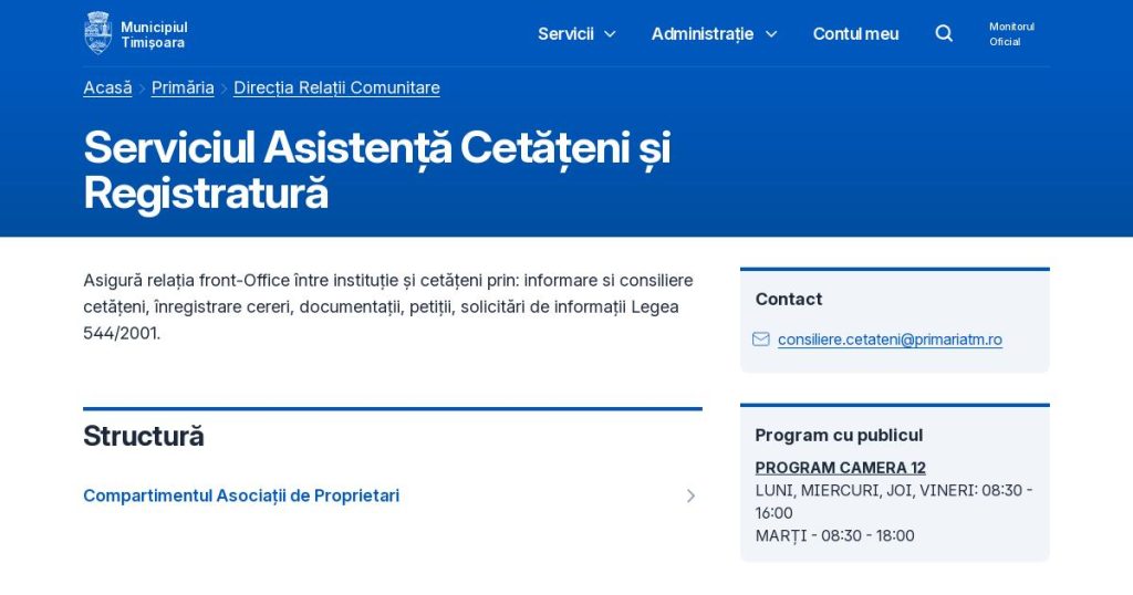 Unul dintre aceste puncte este ceea ce, în limbajul cotidian al Timișoarei, se numește simplu „camera 12”, situată la sediul Primăriei de pe Bulevardul C.D. Loga nr. 1. Dincolo de această etichetă informală, funcția oficială a acestui spațiu este definită clar de instituție drept Serviciul Asistență Cetățeni și Registratură, aflat în subordinea Direcției Relații Comunitare, descris chiar pe site-ul Primăriei ca fiind structura care „asigură relația front-office între instituție și cetățeni prin informare și consiliere, înregistrare cereri, documentații, petiții și solicitări de informații în baza Legii 544/2001”.