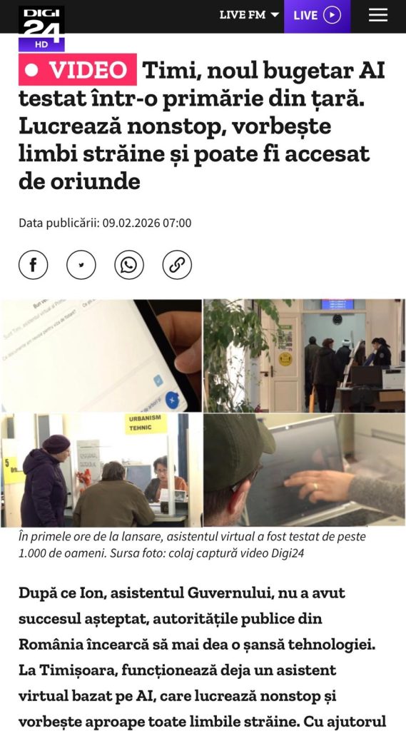 În 4 februarie 2026, Primăria Municipiului Timișoara lansa oficial asistentul virtual „Timi”, prezentat ca un prim pas în integrarea inteligenței artificiale în relația cu cetățeanul. Mesajul public era atent calibrat. Nu vorbim despre o revoluție, ci despre o intrare „timidă” a tehnologiei într-un sistem administrativ complex, în care, în ciuda noilor instrumente digitale, cetățeanul continuă să se bazeze pe interacțiunea directă cu instituția. Concluzia acelui moment, formulată fără ambiguități, era simplă. Detaliat, administrația experimentează digitalizarea, dar realitatea rămâne ancorată în relația umană, iar „camera 12” își păstrează rolul de punct esențial de contact.