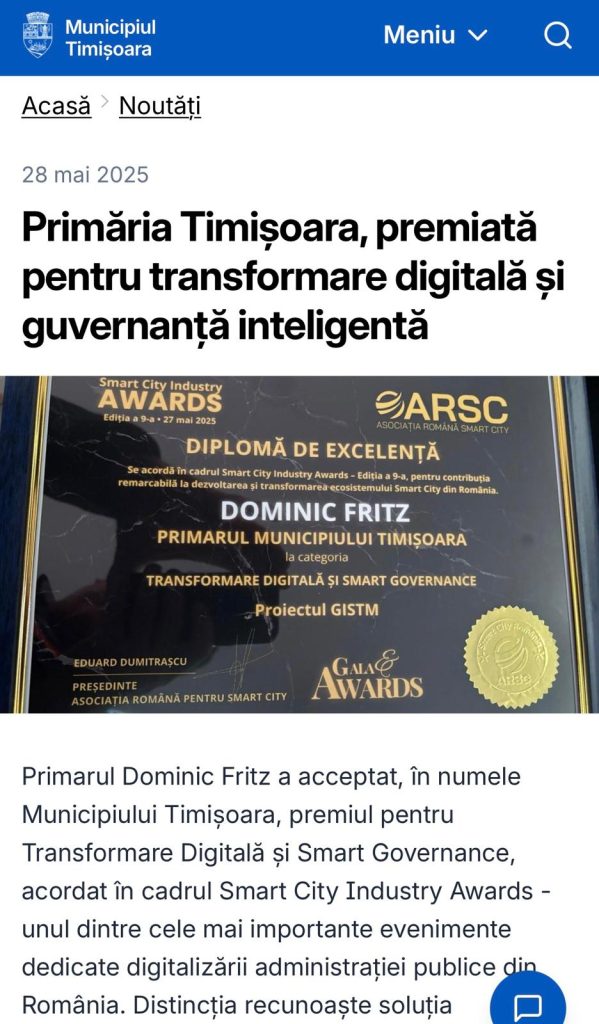 În 28 mai 2025, Primăria Municipiului Timișoara anunța public, printr-un comunicat oficial, că a fost distinsă cu premiul pentru „Transformare Digitală și Smart Governance”, în cadrul galei Smart City Industry Awards, un eveniment prezentat drept unul dintre cele mai importante din România dedicate modernizării administrației publice. Premiul a fost ridicat în numele instituției de primarul Dominic Fritz și a fost atribuit, potrivit comunicării oficiale, pentru soluțiile implementate în zona digitalizării, în special pentru noua platformă GIS bazată pe inteligență artificială.