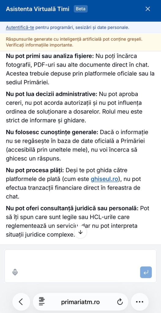 Această schimbare este cu atât mai vizibilă dacă este pusă în raport cu modul în care a fost prezentat chatbot-ul „Timi” la momentul lansării. Atunci, instituția sublinia că sistemul este în fază de dezvoltare, că funcționează pe baza informațiilor existente și că va fi îmbunătățit în timp, pe baza feedback-ului utilizatorilor. Cu alte cuvinte, era recunoscut explicit faptul că instrumentul nu este complet și că nu poate acoperi toate nevoile cetățenilor.