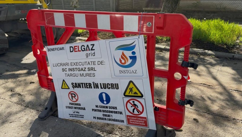 În teren, identificarea lucrării se face printr-un panou montat pe un gard mobil de șantier, pe care sunt înscrise următoarele informații: „Beneficiar: Delgaz Grid” și „Lucrări executate de: SC Instgaz SRL, Târgu Mureș”. Această mențiune stabilește fără echivoc cadrul formal al intervenției. Nu este o lucrare privată, nu este o intervenție punctuală de branșament individual, ci o operațiune integrată în rețeaua publică de distribuție a gazelor.