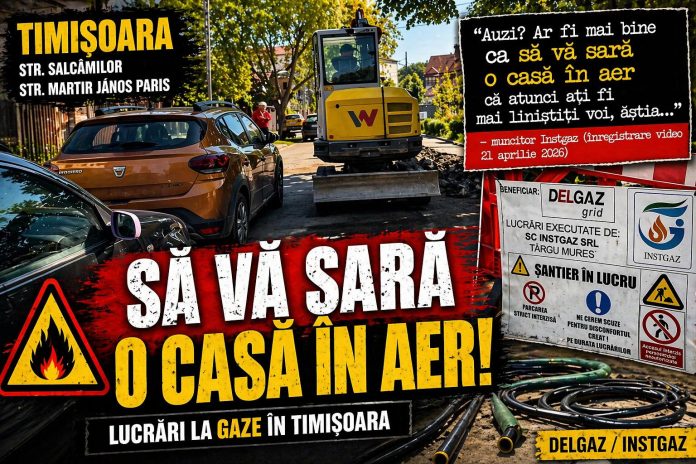 Pe străzile Salcâmilor și Martir János Paris din Timișoara se sapă la rețeaua de gaze. Oficial, lucrarea este pentru modernizare, executată de Instgaz pentru Delgaz Grid. În teren, însă, realitatea arată altfel. Utilaje în mișcare la câțiva centimetri de mașini, trafic blocat, lipsă de responsabil vizibil și o amenințare filmată, care nu ar trebui să existe într-un astfel de șantier. Improvizat și tolerat.
