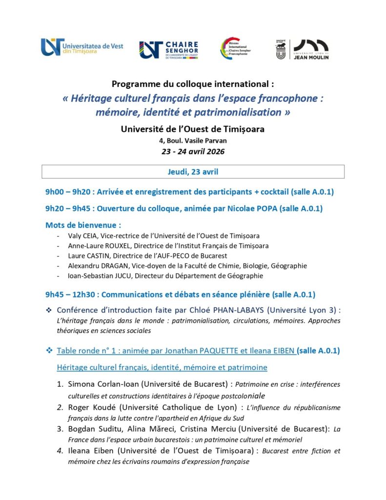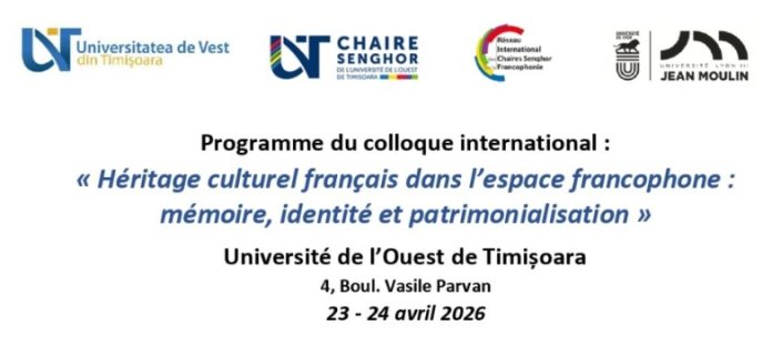 Avem onoarea de vă invita să participați la Conferința internațională „Patrimoniul cultural francez în lumea francofonă: memorie, identitate și conservarea patrimoniului”, care va fi organizata la Universitatea de Vest din Timișoara (UVT) în 23 și 24 aprilie 2026. Deschiderea evenimentului va avea loc în 23 aprilie, de la ora 9.20, în amfiteatrul de evenimente A01 (sediul principal, V.Pârvan 4).