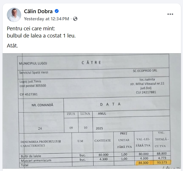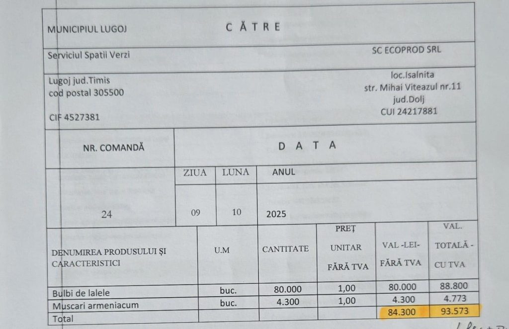 Când apare vizual formula „5 euro bucata” pentru bulbi de lalele, iar documentul administrativ — comanda nr. 24 din 9 octombrie 2025, emisă de Municipiul Lugoj către SC Ecoprod SRL, cu sediul în Isalnița, strada Mihai Viteazul nr. 11, județul Dolj, CUI 24217881 — indică un preț de 1 leu per unitate pentru 80.000 de bulbi, diferența nu mai este una de interpretare.