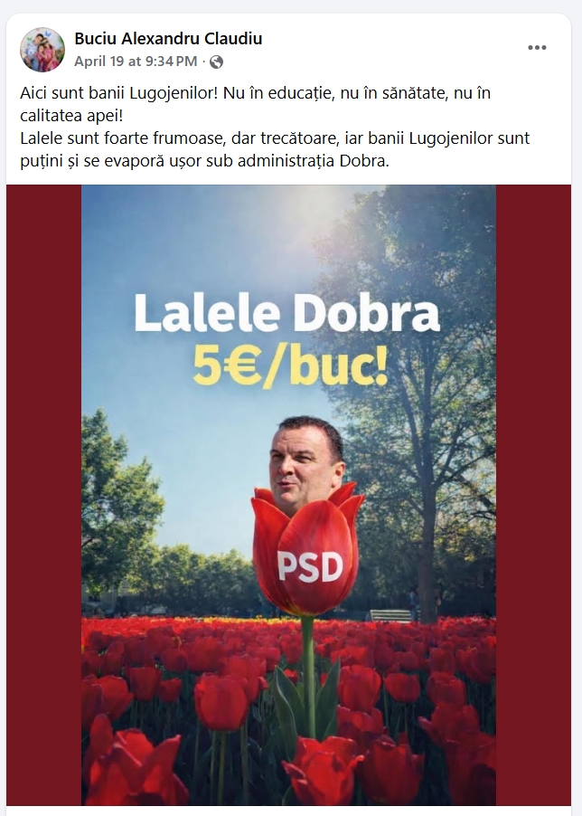 În paralel însă, același Claudiu Buciu construiește propriul său tip de comunicare, folosind exact aceleași instrumente digitale, dar cu o finalitate diferită. Postările sale recente sunt însoțite de imagini infantile și deloc subtile, editate, colaje și reprezentări grafice în care adversarii politici apar în ipostaze caricaturale, simplificate până la nivel de slogan vizual. Lalele cu simboluri politice, prețuri rotunde aruncate fără sursă — „5 euro bucata” — sau cifre spectaculoase precum „12.960 litri de carburant”, prezentate fără perioadă de referință și fără document justificativ.