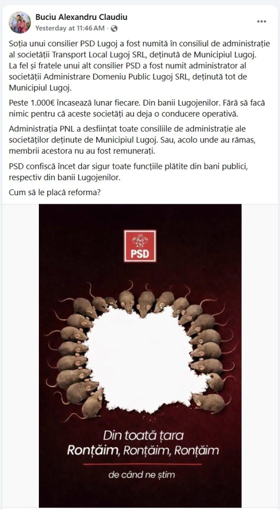 Într-o altă postare, discursul este extins dincolo de nivelul local și este conectat la scena politică națională: „PSD împarte România între ei, iar la Lugoj se vede cel mai bine.”