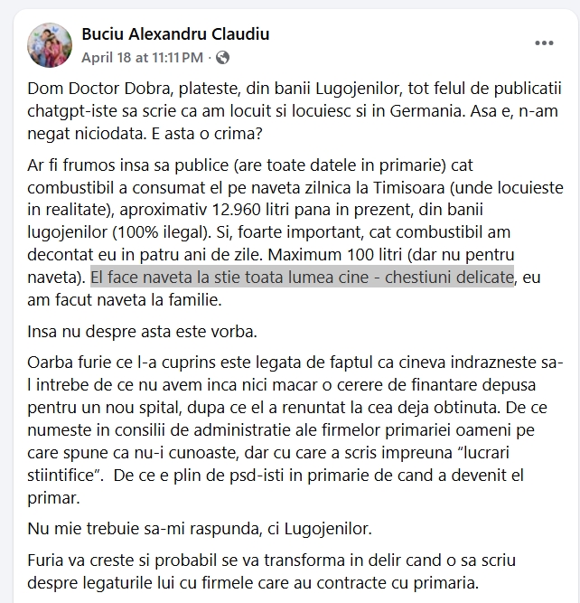 Citatul este acesta: „Domn Doctor Dobra, plătește, din banii lugojenilor, tot felul de publicații chatgpt-iste să scrie că am locuit și locuiesc și în Germania. Așa e, n-am negat niciodată. E asta o crimă?