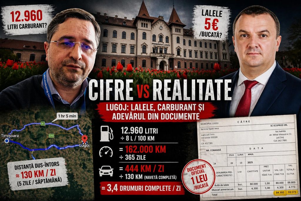 După publicarea episodului I al investigației noastre, fostul primar al municipiului Lugoj, Claudiu Alexandru Buciu, a ales să răspundă nu prin documente sau explicații punctuale, ci prin cifre. Mari, rotunde și ușor de reținut. 12.960 de litri de carburant, lalele de „5 euro bucata”, acuzații formulate categoric și distribuite rapid.
