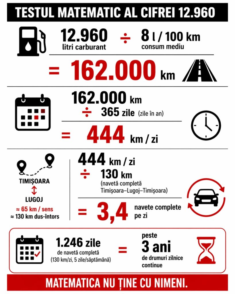 Cifra de 12.960 de litri nu este însoțită de o perioadă clar delimitată, nu este legată de un tip de vehicul, nu este susținută de documente și nu este raportată la un consum tehnic verificabil. Ea apare ca o valoare absolută, fără context, ceea ce o face imposibil de validat.