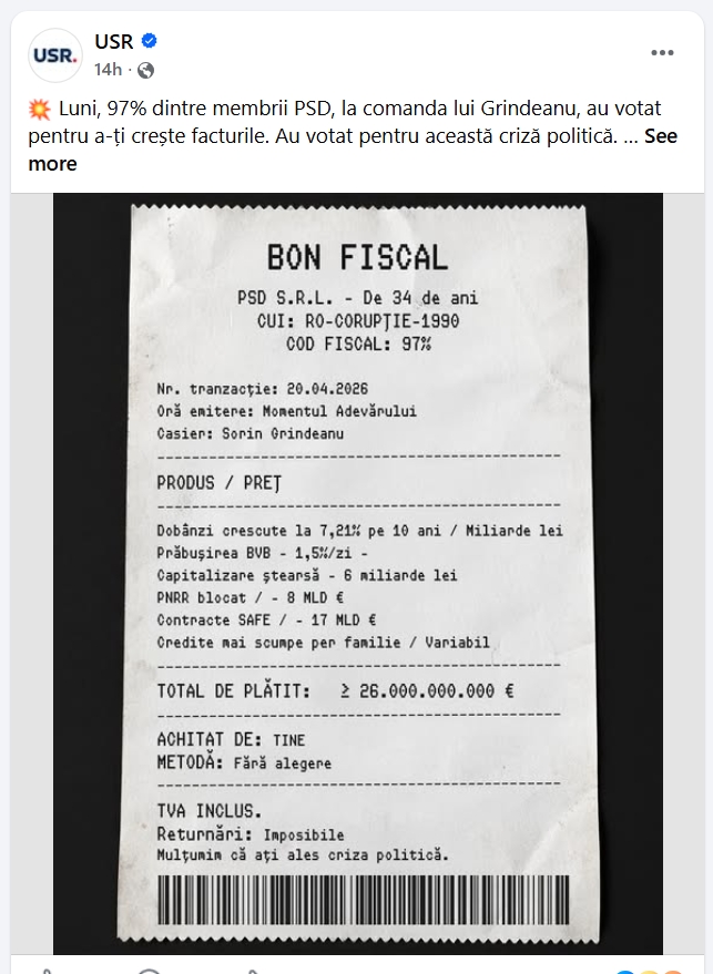 USR încearcă să traducă o criză economică într-un „bon fiscal” viral. Problema nu e doar infantilizarea discursului, ci și folosirea unui format oficial pentru un mesaj propagandistic. Iar dincolo de glumă, întrebarea este unde sunt cifrele, mecanismele și responsabilitățile concrete?