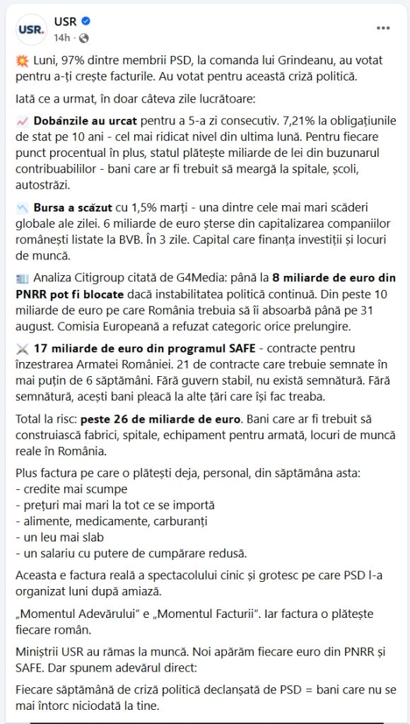 Postarea USR încearcă să construiască un lanț cauzal simplu. PSD generează o criză politică care duce la efecte economice – ele există deja demult și PNL + USR au pus masiv osul în acest guvern la colapsul economic. USR pretinde că infantila lor „factură” este plătită de fiecare român. Problema nu este direcția generală, adică instabilitatea politică afectează economia, ci modul în care acest lanț este simplificat până la distorsiune.