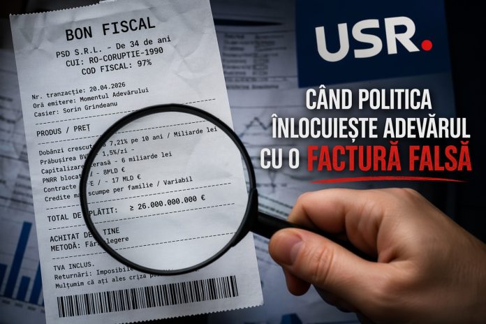 În loc să explice o criză economică în termeni reali – cu cifre, decizii și consecințe – USR a ales varianta scurtă: un „bon fiscal” fictiv, ambalat ca pamflet politic. Un format recognoscibil, dar golit de sens. Pentru că atunci când reduci economia la o listă de produse și un total rotund, nu simplifici realitatea – o falsifici narativ.
