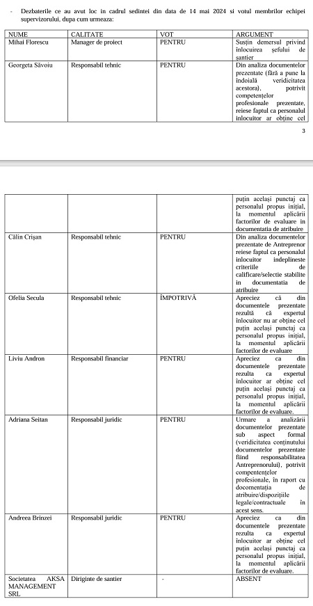 Mai mult, din analiza documentelor privind înlocuirea șefului de șantier rezultă un mecanism de decizie care ridică semne serioase de întrebare. În procesul-verbal al ședinței din 14 mai 2024, majoritatea membrilor echipei votează „pentru” înlocuire, în timp ce o singură persoană — specialist tehnic — votează împotrivă, motivând explicit lipsa echivalenței profesionale a înlocuitorului.